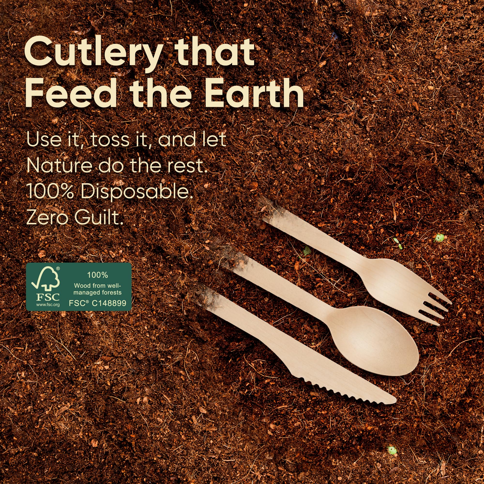 Eco-Friendly Choice: A sustainable alternative to plastic or corn-based disposable utensils. Biodegradable wooden spoons, forks, and knives can be disposed of with food waste.