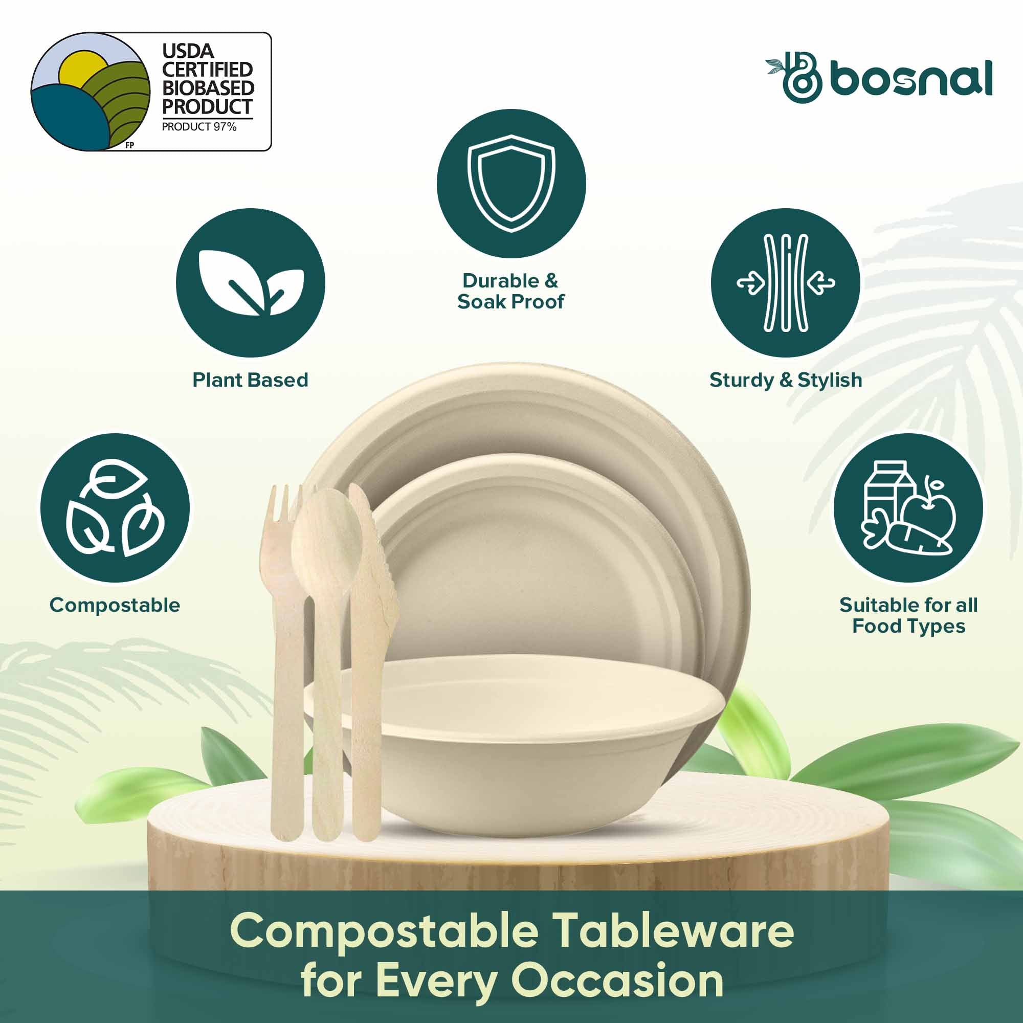 Serve meals responsibly with BOSNAL 10 inch & 7 inch Round Plates with 32 oz Bowls & Cutlery. Crafted from 100% plant-based sugarcane bagasse, this set is fully biodegradable and compostable, providing a sustainable alternative to traditional plastic or foam tableware.