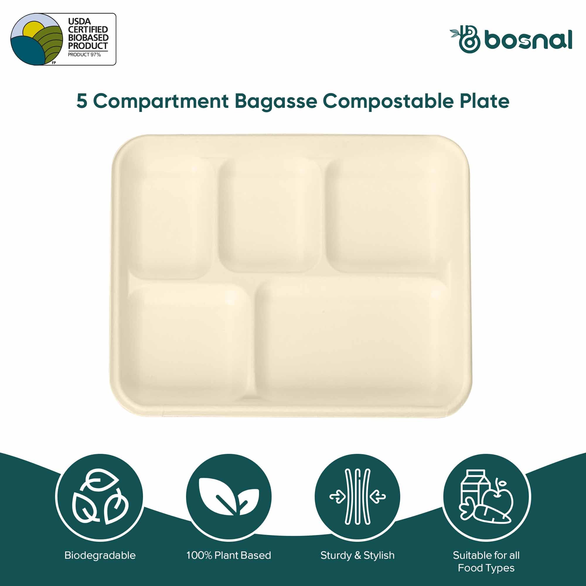 Enjoy a cleaner, greener way to serve meals with BOSNAL 5-Compartment Compostable Food Trays. Designed with eco-conscious consumers and food service providers in mind, these trays are made from 100% natural sugarcane fibers (bagasse) - a renewable, biodegradable, and compostable material that returns to the earth safely.