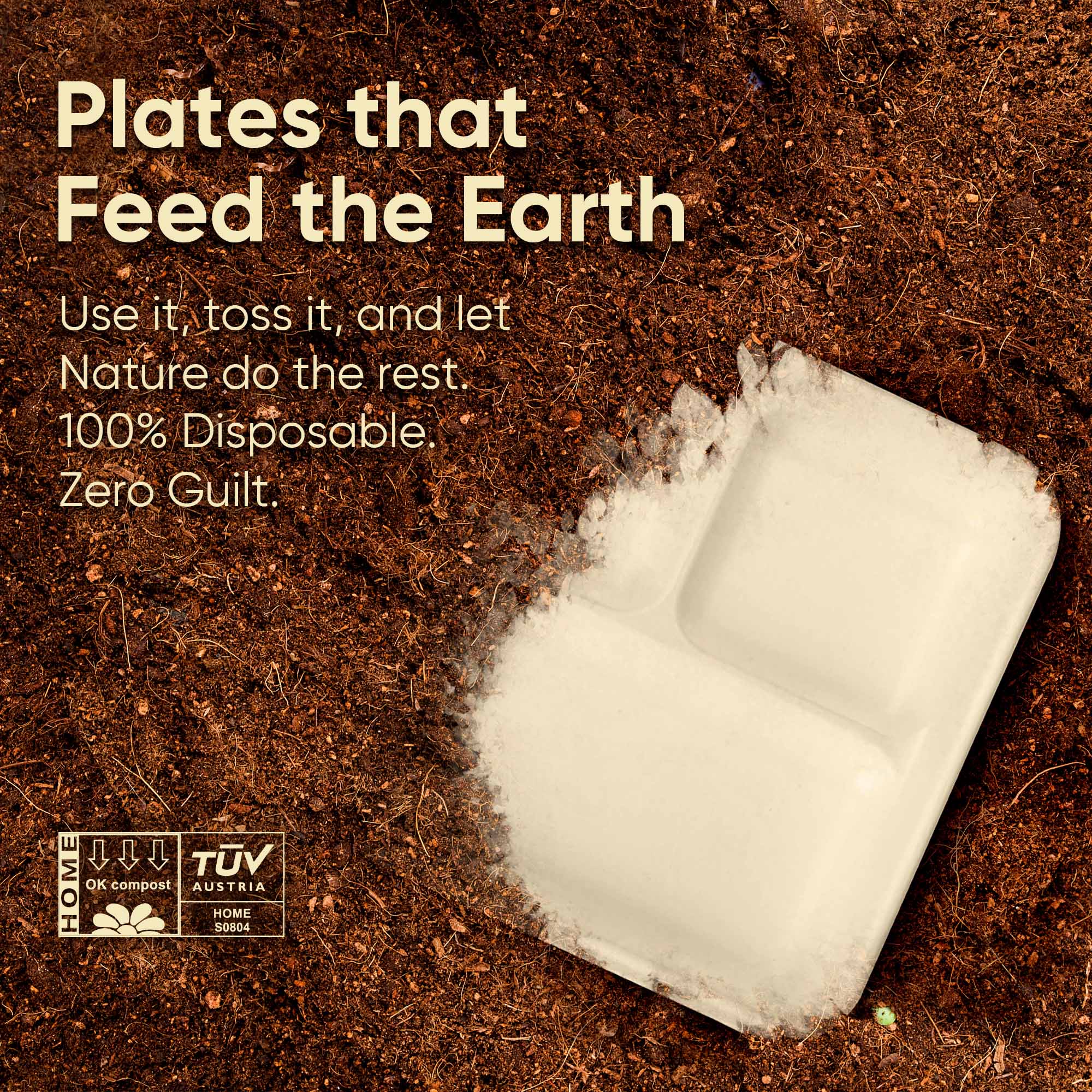 Our trays are made from reclaimed sugarcane pulp, transforming agricultural byproducts into durable, functional, and planet-friendly dinnerware. Once disposed of, they naturally decompose into nutrient-rich soil, helping reduce waste and pollution.