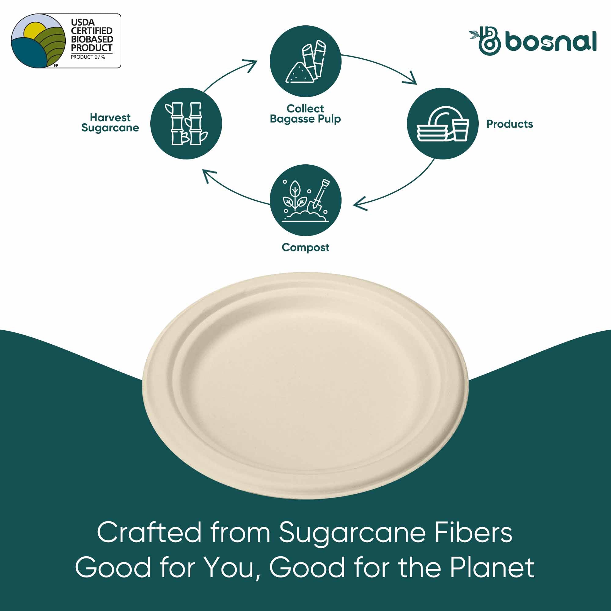 - ECO-FRIENDLY & COMPOSTABLE: Made from 100% natural sugarcane fibers (bagasse), BOSNAL 7-inch round plates are fully biodegradable and compostable-offering a sustainable, plastic-free alternative for everyday meals and events.