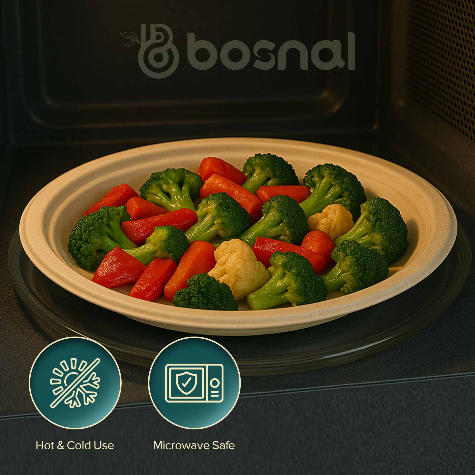 BOSNAL 7 Inch Compostable Round Plates combine practicality, sustainability, and style. Made from 100% reclaimed sugarcane fibers (bagasse), these eco-friendly plates are fully biodegradable and suitable for composting - helping you enjoy meals without harming the environment.From Plant to Product to PlanetOur plates are crafted from renewable sugarcane pulp, transforming agricultural byproducts into durable, stylish and eco-conscious dinnerware. After use, they naturally decompose into nutrient-rich soil, reducing landfill waste.Perfect for Snacks & Small MealsWhether serving small meals, appetizers, desserts, or salads, BOSNAL 7-inch plates are sturdy, microwave-safe, BPA-free and leak-resistant - providing a reliable, eco-friendly option for homes, parties, catering or events.
