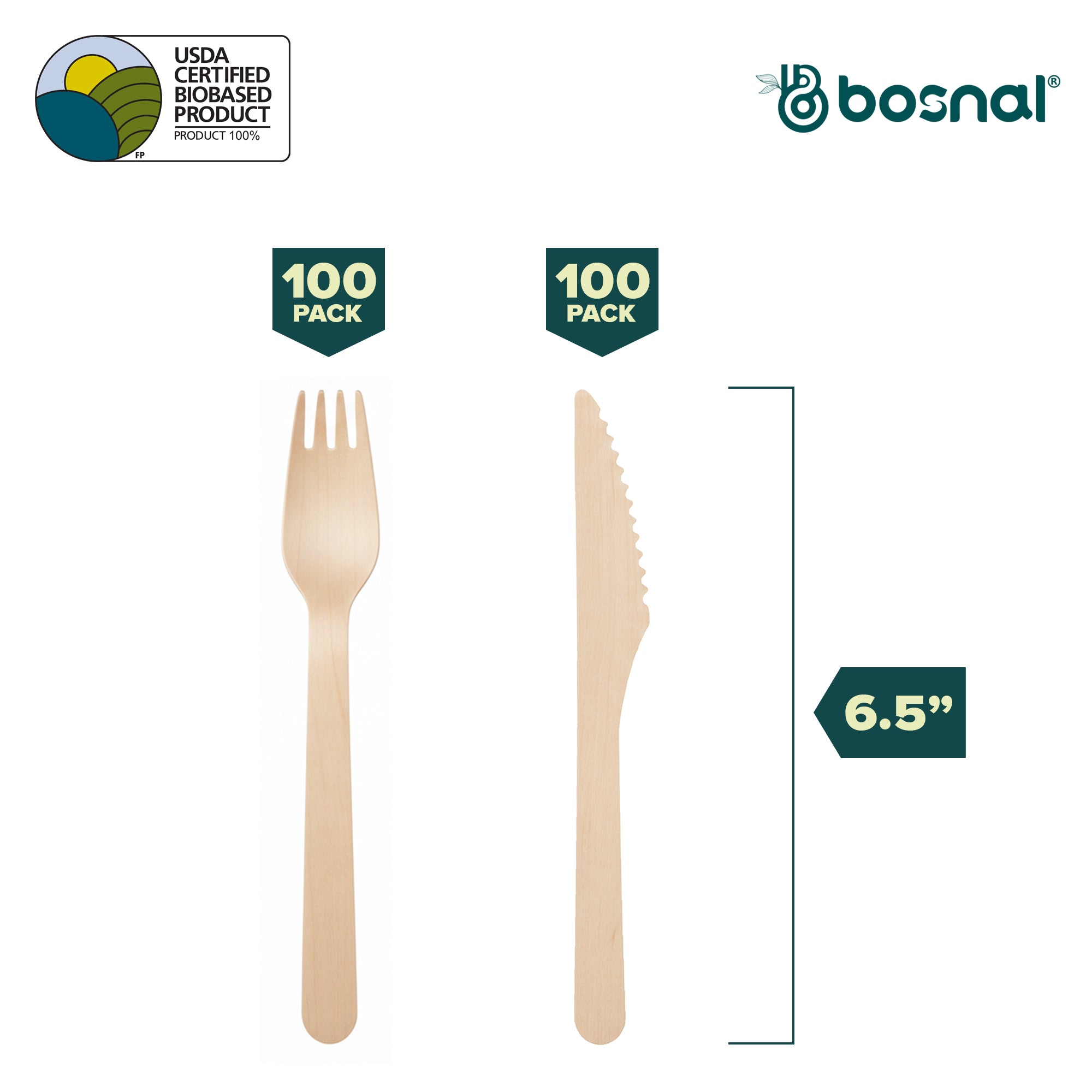 Material & Safety: Made from 100% natural smooth birch wood. This200-piece wooden cutlery setincludes100 forks and 100 knives. BPA-free, plastic-free, compostable and biodegradable - safe for food contact.